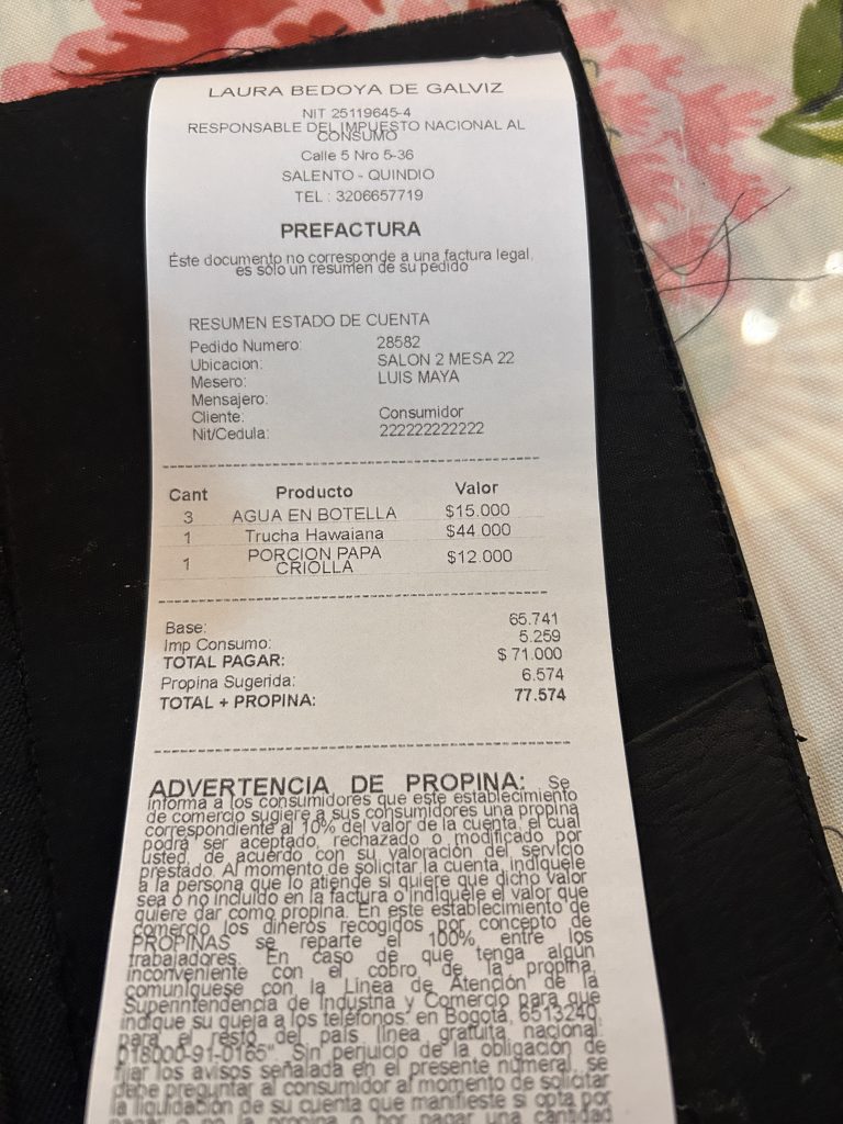 Al día siguiente al mediodía nos tomamos una cerveza, dos vinos y una limonada de coco por unos 13,63 €, en la misma plaza de Bolívar de Salento.